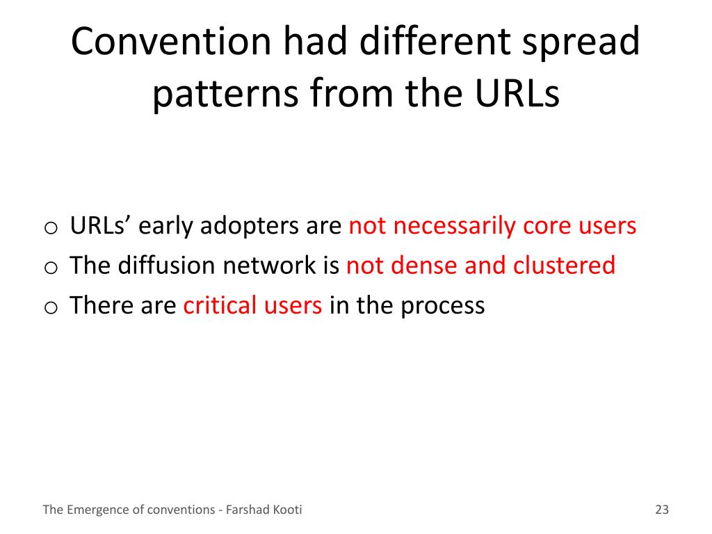 Convention had different spread patterns from the URLs The Emergence of conventions - FarshadKooti • URLs’ early adopters are not necessarily core users • The diffusion network is not dense and clustered • There are critical users in the process
