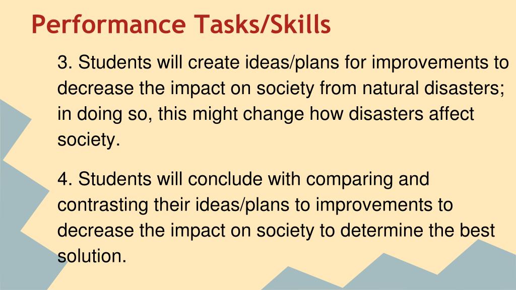 Performance Tasks/Skills 3. Students will create ideas/plans for improvements to decrease the impact on society from natural disasters; in doing so, this might change how disasters affect society. 4. Students will conclude with comparing and contrasting their ideas/plans to improvements to decrease the impact on society to determine the best solution.