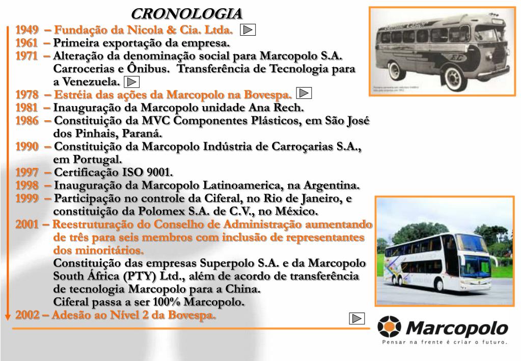 CRONOLOGIA • 1949 –Fundação da Nicola & Cia. Ltda. • 1961 – Primeira exportação da empresa. • 1971 – Alteração da denominação social para Marcopolo S.A. Carrocerias e Ônibus. Transferência de Tecnologia para a Venezuela. • 1978 – Estréia das ações da Marcopolo na Bovespa. • 1981 – Inauguração da Marcopolo unidade Ana Rech. • 1986 – Constituição da MVC Componentes Plásticos, em São José dos Pinhais, Paraná. • 1990 – Constituição da Marcopolo Indústria de Carroçarias S.A., em Portugal. • 1997 – Certificação ISO 9001. • 1998 – Inauguração da Marcopolo Latinoamerica, na Argentina. • 1999 – Participação no controle da Ciferal, no Rio de Janeiro, e constituição da Polomex S.A. de C.V., no México. • –Reestruturação do Conselho de Administração aumentando de três para seis membros com inclusão de representantes dos minoritários. • Constituição das empresas Superpolo S.A. e da Marcopolo South África (PTY) Ltd., além de acordo de transferência de tecnologia Marcopolo para a China. Ciferal passa a ser 100% Marcopolo. • 2002 – Adesão ao Nível 2 da Bovespa.