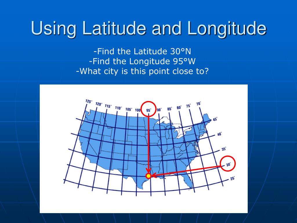 Using Latitude and Longitude -Find the Latitude 30°N -Find the Longitude 95°W -What city is this point close to?