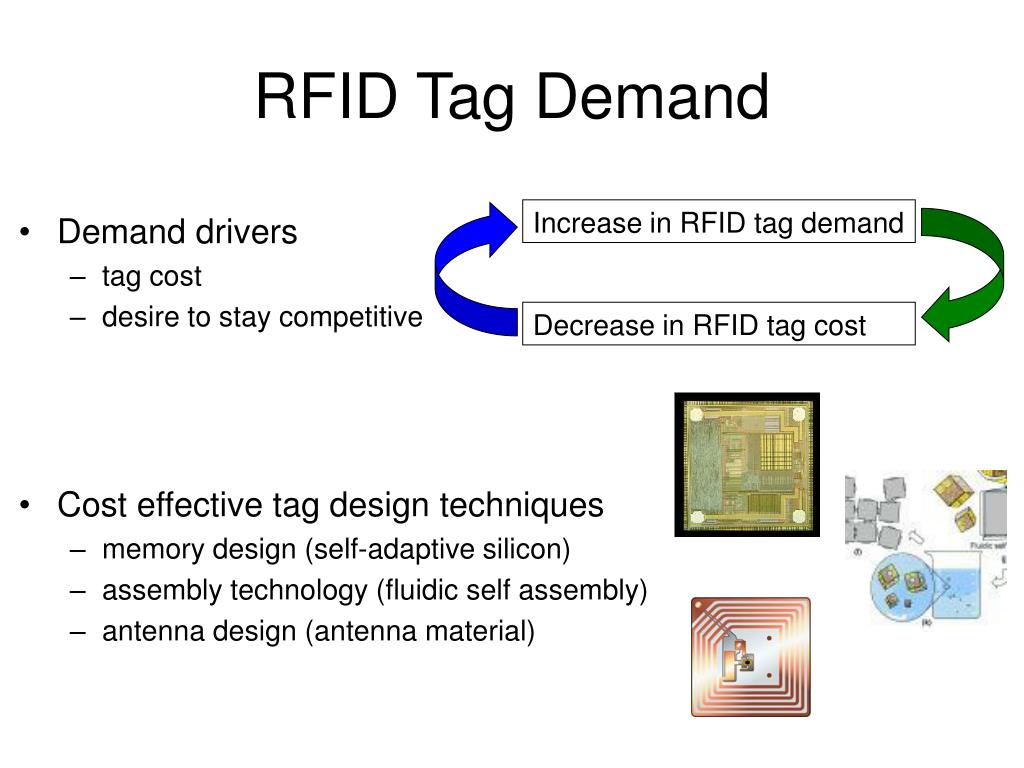 Increase in RFID tag demand Decrease in RFID tag cost RFID Tag Demand • Demand drivers • tag cost • desire to stay competitive • Cost effective tag design techniques • memory design (self-adaptive silicon) • assembly technology (fluidic self assembly) • antenna design (antenna material)