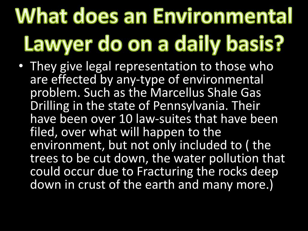 What does an Environmental Lawyer do on a daily basis? • They give legal representation to those who are effected by any-type of environmental problem. Such as the Marcellus Shale Gas Drilling in the state of Pennsylvania. Their have been over 10 law-suites that have been filed, over what will happen to the environment, but not only included to ( the trees to be cut down, the water pollution that could occur due to Fracturing the rocks deep down in crust of the earth and many more.)