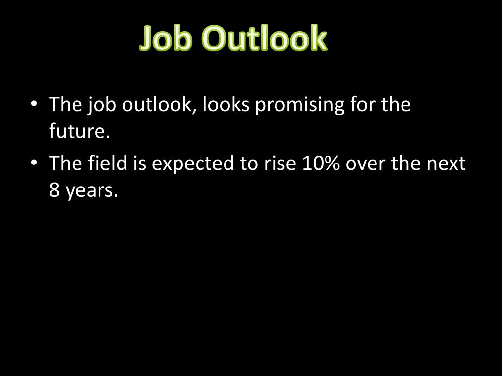 Job Outlook • The job outlook, looks promising for the future. • The field is expected to rise 10% over the next 8 years.