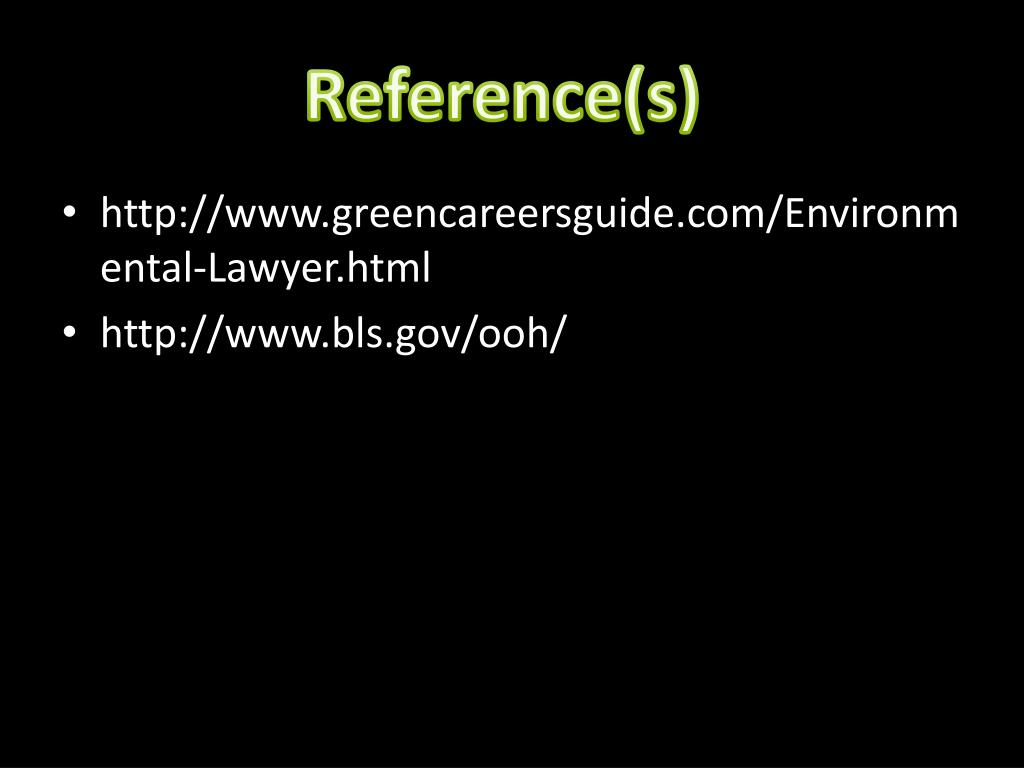 Reference(s) • http://www.greencareersguide.com/Environmental-Lawyer.html • http://www.bls.gov/ooh/