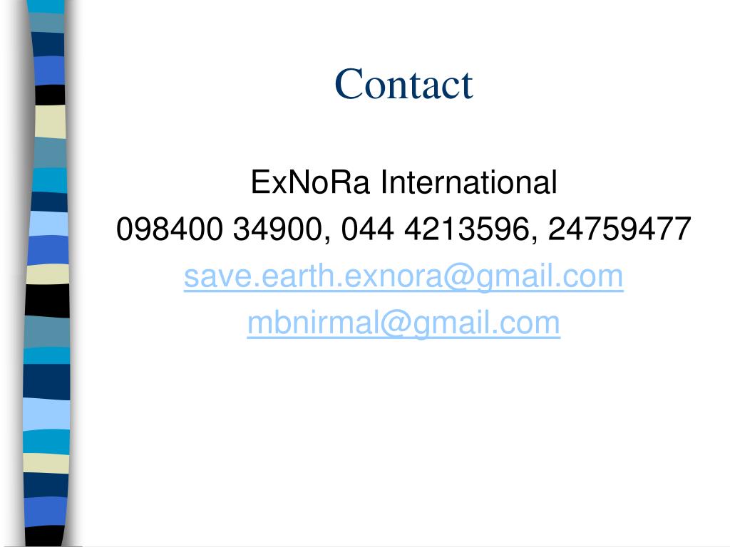 Contact ExNoRa International 098400 34900, 044 4213596, 24759477 save.earth.exnora@gmail.com mbnirmal@gmail.com