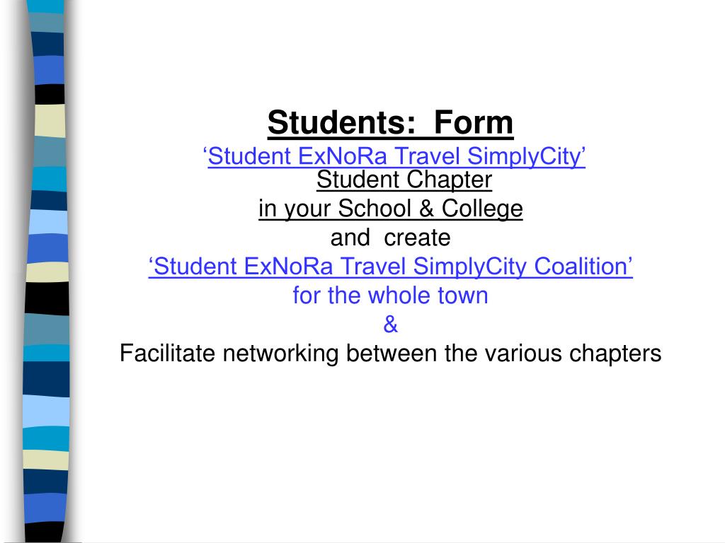 Students: Form ‘Student ExNoRa Travel SimplyCity’ Student Chapter in your School & College and create ‘Student ExNoRa Travel SimplyCity Coalition’ for the whole town & Facilitate networking between the various chapters
