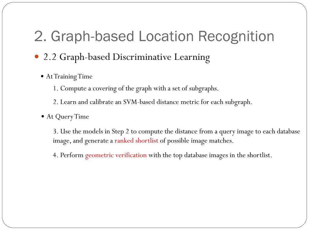 2. Graph-based Location Recognition • 2.2 Graph-based Discriminative Learning ․At Training Time 1. Compute a covering of the graph with a set of subgraphs. 2. Learn and calibrate an SVM-based distance metric for each subgraph. ․At Query Time 3. Use the models in Step 2 to compute the distance from a query image to each database image, and generate a ranked shortlist of possible image matches. 4. Perform geometric verification with the top database images in the shortlist.