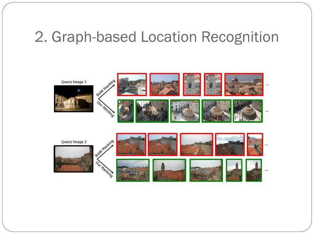 2. Graph-based Location Recognition (b)BoWRegularization ․Our learned discriminative models often perform well, but we observed that for some rare query images, our models consistently perform poorly ․If this value is less than a threshold (we use 0.1), then BoW ranking goes first,else do tf-idf ranking
