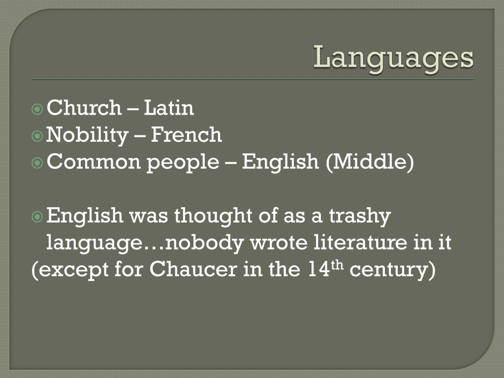 Languages • Church – Latin • Nobility – French • Common people – English (Middle) • English was thought of as a trashy language…nobody wrote literature in it (except for Chaucer in the 14th century)