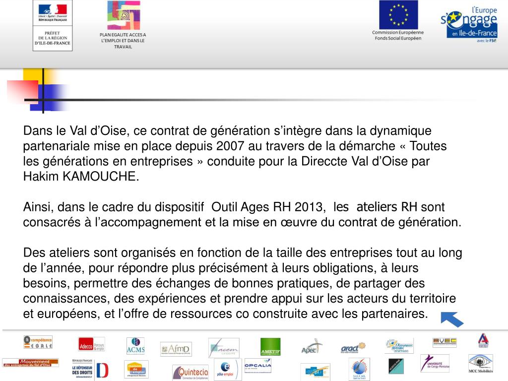 Dans le Val d’Oise, ce contrat de génération s’intègre dans la dynamique partenariale mise en place depuis 2007 au travers de la démarche « Toutes les générations en entreprises » conduite pour la Direccte Val d’Oise par Hakim KAMOUCHE. Ainsi, dans le cadre du dispositif Outil Ages RH 2013, les ateliers RH sont consacrés à l’accompagnement et la mise en œuvre du contrat de génération. Des ateliers sont organisés en fonction de la taille des entreprises tout au long de l’année, pour répondre plus précisément à leurs obligations, à leurs besoins, permettre des échanges de bonnes pratiques, de partager des connaissances, des expériences et prendre appui sur les acteurs du territoire et européens, et l’offre de ressources co construite avec les partenaires.