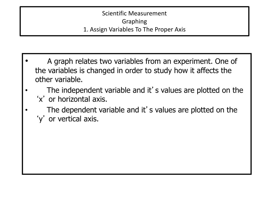 Scientific MeasurementGraphing1. Assign Variables To The Proper Axis • A graph relates two variables from an experiment. One of the variables is changed in order to study how it affects the other variable. • The independent variable and it’s values are plotted on the ‘x’ or horizontal axis. • The dependent variable and it’s values are plotted on the ‘y’ or vertical axis.