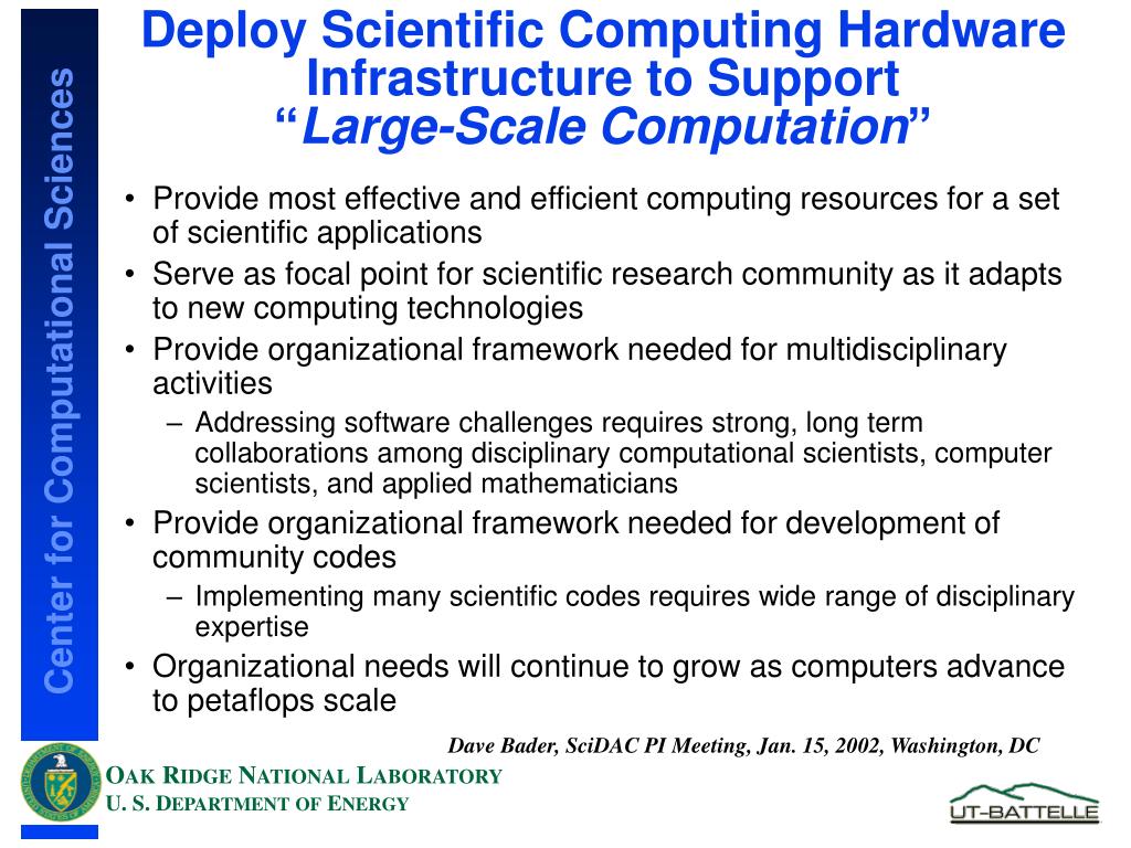 Deploy Scientific Computing Hardware Infrastructure to Support “Large-Scale Computation” • Provide most effective and efficient computing resourcesfor a set of scientific applications • Serve as focal point for scientific research community as it adapts to new computing technologies • Provide organizational framework needed for multidisciplinary activities • Addressing software challenges requires strong, long term collaborations among disciplinary computational scientists, computer scientists, and applied mathematicians • Provide organizational framework needed for development of community codes • Implementing many scientific codes requires wide range of disciplinary expertise • Organizational needs will continue to grow as computers advance to petaflops scale Dave Bader, SciDAC PI Meeting, Jan. 15, 2002, Washington, DC