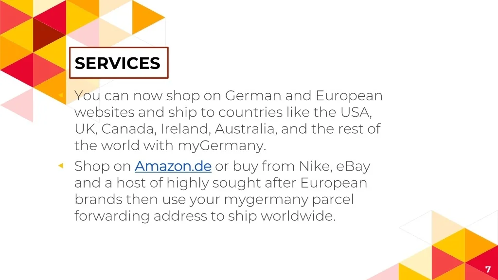 SERVICEs • You can now shop on German and European websites and ship to countries like the USA, UK, Canada, Ireland, Australia, and the rest of the world with myGermany. • Shop on Amazon.de or buy from Nike, eBay and a host of highly sought after European brands then use your mygermanyparcel forwarding address to ship worldwide.