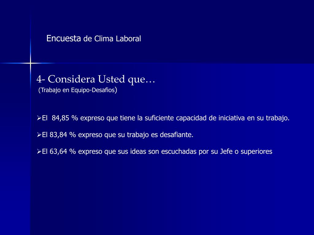 Encuesta de Clima Laboral • 4- Considera Usted que… • (Trabajo en Equipo-Desafios) • El 84,85 % expreso que tiene la suficiente capacidad de iniciativa en su trabajo. • El 83,84 % expreso que su trabajo es desafiante. • El 63,64 % expreso que sus ideas son escuchadas por su Jefe o superiores
