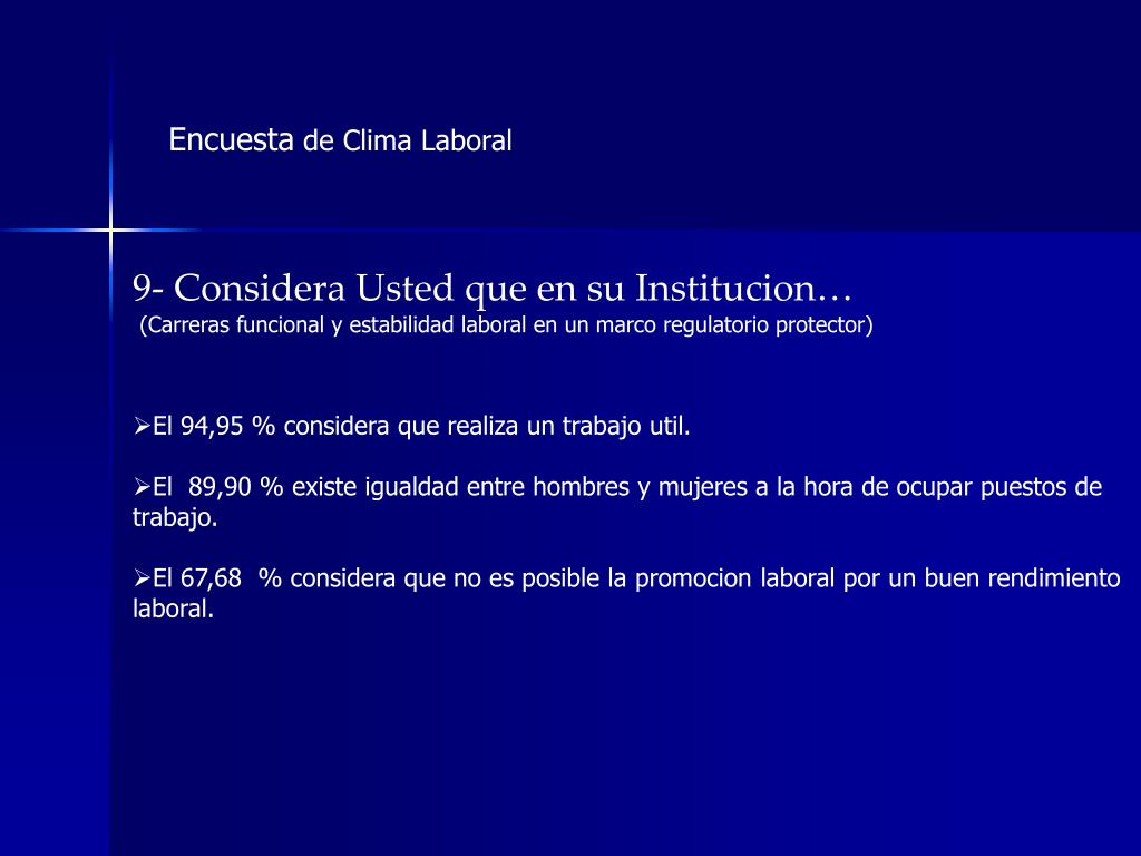 Encuesta de Clima Laboral • 9- Considera Usted que en su Institucion… • (Carreras funcional y estabilidad laboral en un marco regulatorio protector) • El 94,95 % considera que realiza un trabajo util. • El 89,90 % existe igualdad entre hombres y mujeres a la hora de ocupar puestos de trabajo. • El 67,68 % considera que no es posible la promocion laboral por un buen rendimiento laboral.