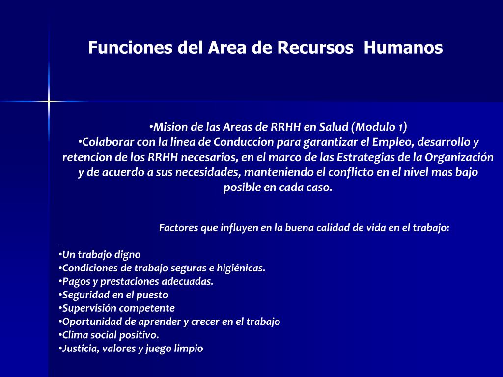 Funciones del Area de Recursos Humanos • Factores que influyen en la buena calidad de vida en el trabajo: • Un trabajo digno • Condiciones de trabajo seguras e higiénicas. • Pagos y prestaciones adecuadas. • Seguridad en el puesto • Supervisión competente • Oportunidad de aprender y crecer en el trabajo • Clima social positivo. • Justicia, valores y juego limpio • Mision de las Areas de RRHH en Salud (Modulo 1) • Colaborar con la linea de Conduccion para garantizar el Empleo, desarrollo y retencion de los RRHH necesarios, en el marco de las Estrategias de la Organización y de acuerdo a sus necesidades, manteniendo el conflicto en el nivel mas bajo posible en cada caso.