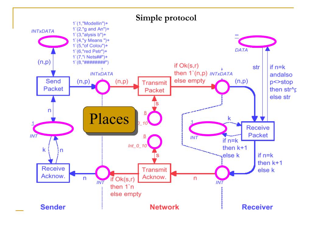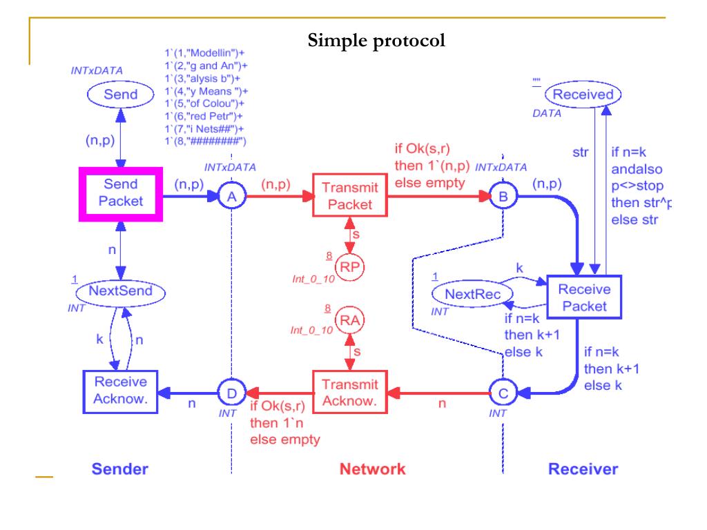 if Ok(s,r) INTxDATA INTxDATA then 1`(n,p) Transmit (n,p) else empty A B Packet 1 1`(1,"Modellin") s 8 RP 1`8 1 Int_0_10 Transmit packet r 1. .10 • All enabled bindings are on the form: • <n=1,p= "Modellin",s=8,r=...> • where r 1. .10 s = 8 n = 1, p = "Modellin"