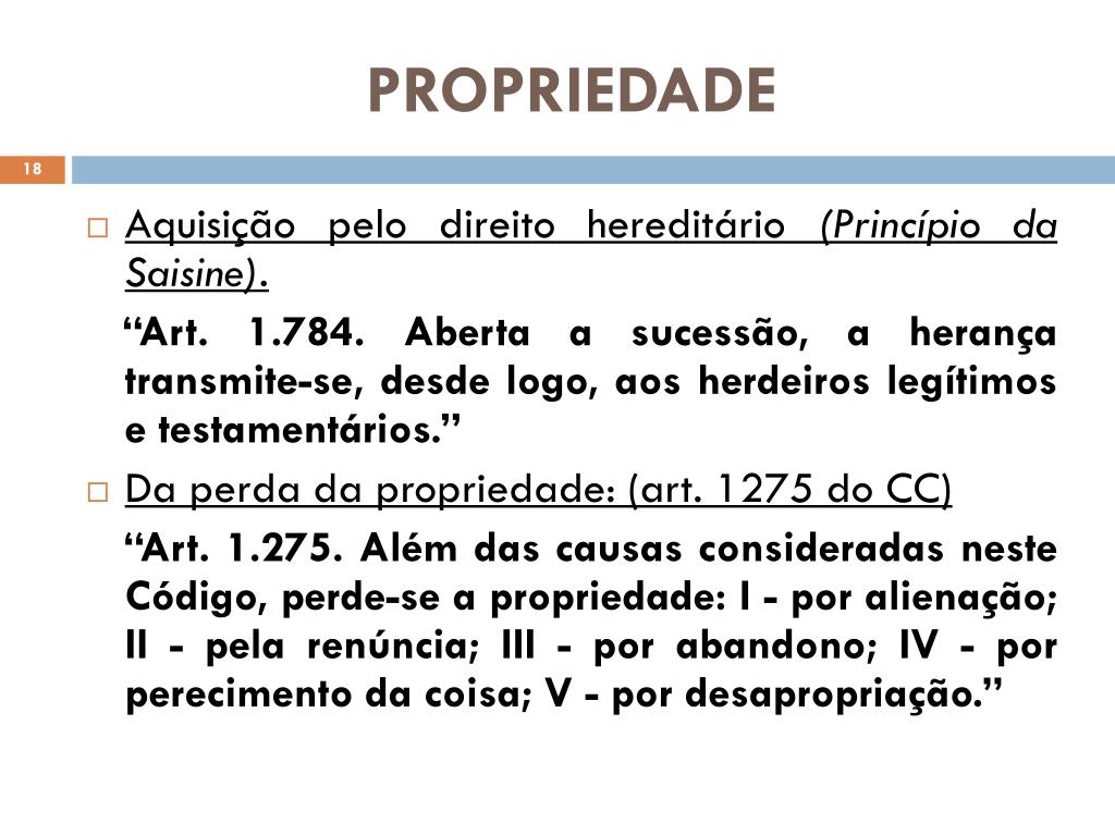 PROPRIEDADE • Aquisição pelo direito hereditário (Princípio da Saisine). “Art. 1.784. Aberta a sucessão, a herança transmite-se, desde logo, aos herdeiros legítimos e testamentários.” • Da perda da propriedade: (art. 1275 do CC) “Art. 1.275. Além das causas consideradas neste Código, perde-se a propriedade: I - por alienação; II - pela renúncia; III - por abandono; IV - por perecimento da coisa; V - por desapropriação.”