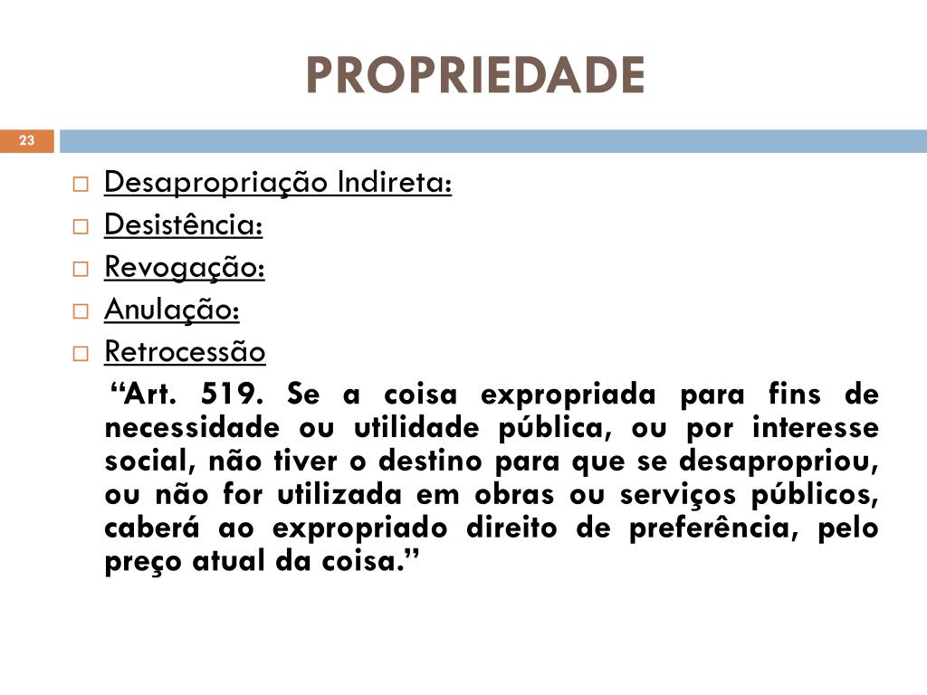 PROPRIEDADE • Desapropriação Indireta: • Desistência: • Revogação: • Anulação: • Retrocessão “Art. 519. Se a coisa expropriada para fins de necessidade ou utilidade pública, ou por interesse social, não tiver o destino para que se desapropriou, ou não for utilizada em obras ou serviços públicos, caberá ao expropriado direito de preferência, pelo preço atual da coisa.”