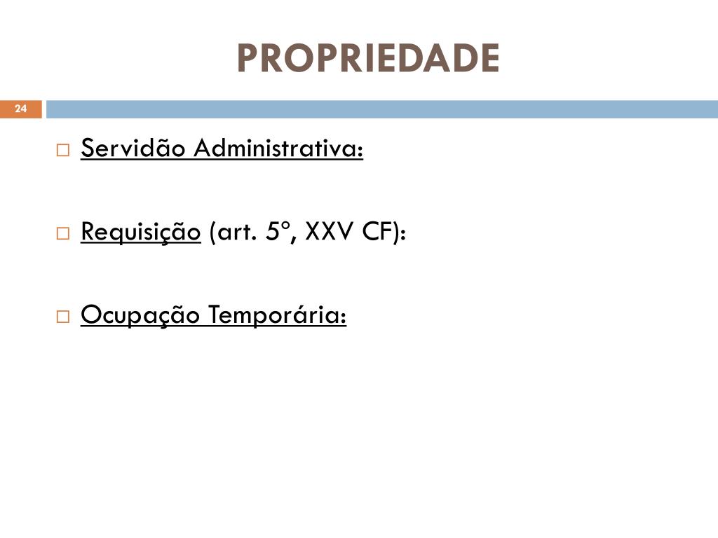 PROPRIEDADE • Servidão Administrativa: • Requisição (art. 5º, XXV CF): • Ocupação Temporária: