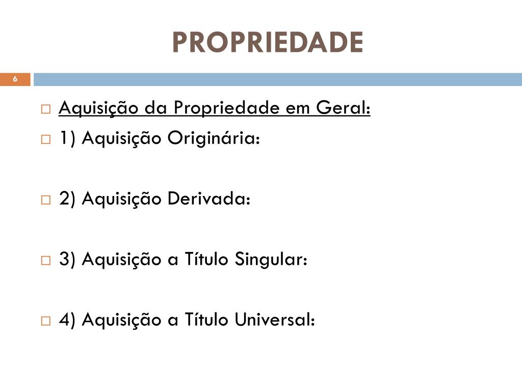 PROPRIEDADE • Aquisição da Propriedade em Geral: • 1) Aquisição Originária: • 2) Aquisição Derivada: • 3) Aquisição a Título Singular: • 4) Aquisição a Título Universal: