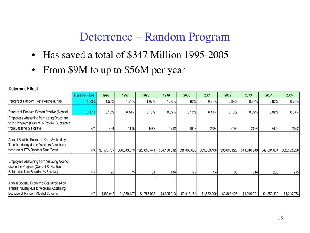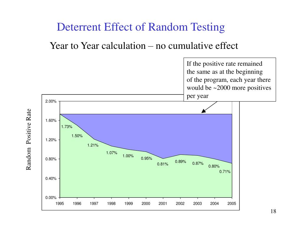 Deterrent Effect of Random Testing Year to Year calculation – no cumulative effect If the positive rate remained the same as at the beginning of the program, each year there would be ~2000 more positives per year Random Positive Rate