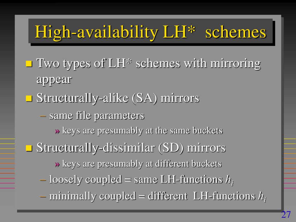 High-availability LH* schemes • Two types of LH* schemes with mirroring appear • Structurally-alike (SA) mirrors • same file parameters • keys are presumably at the same buckets • Structurally-dissimilar (SD) mirrors • keys are presumably at different buckets • loosely coupled = same LH-functions hi • minimally coupled = different LH-functions hi