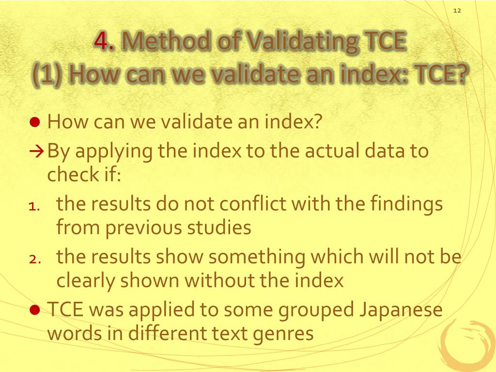 4. Method of Validating TCE(1) How can we validate an index: TCE? • How can we validate an index? • By applying the index to the actual data to check if: • the results do not conflict with the findings from previous studies • the results show something which will not be clearly shown without the index • TCE was applied to some grouped Japanese words in different text genres