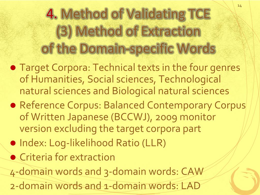 4. Method of Validating TCE(3) Method of Extractionof the Domain-specific Words • Target Corpora: Technical texts in the four genres of Humanities, Social sciences, Technological natural sciences and Biological natural sciences • Reference Corpus: Balanced Contemporary Corpus of Written Japanese (BCCWJ), 2009 monitor version excluding the target corpora part • Index: Log-likelihood Ratio (LLR) • Criteria for extraction 4-domain words and 3-domain words: CAW 2-domain words and 1-domain words: LAD