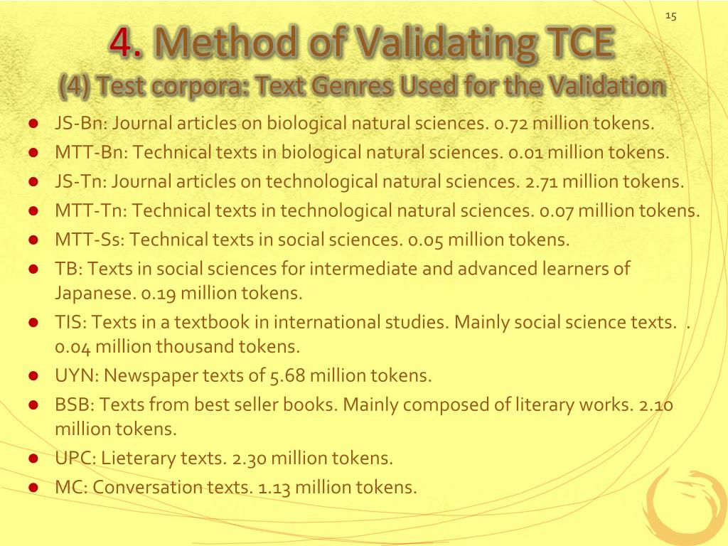 4. Method of Validating TCE(4) Test corpora: Text Genres Used for the Validation • JS-Bn: Journal articles on biological natural sciences. 0.72 million tokens. • MTT-Bn: Technical texts in biological natural sciences. 0.01 million tokens. • JS-Tn: Journal articles on technological natural sciences. 2.71 million tokens. • MTT-Tn: Technical texts in technological natural sciences. 0.07 million tokens. • MTT-Ss: Technical texts in social sciences. 0.05 million tokens. • TB: Texts in social sciences for intermediate and advanced learners of Japanese. 0.19 million tokens. • TIS: Texts in a textbook in international studies. Mainly social science texts. . 0.04 million thousand tokens. • UYN: Newspaper texts of 5.68 million tokens. • BSB: Texts from best seller books. Mainly composed of literary works. 2.10 million tokens. • UPC: Lieterary texts. 2.30 million tokens. • MC: Conversation texts. 1.13 million tokens.