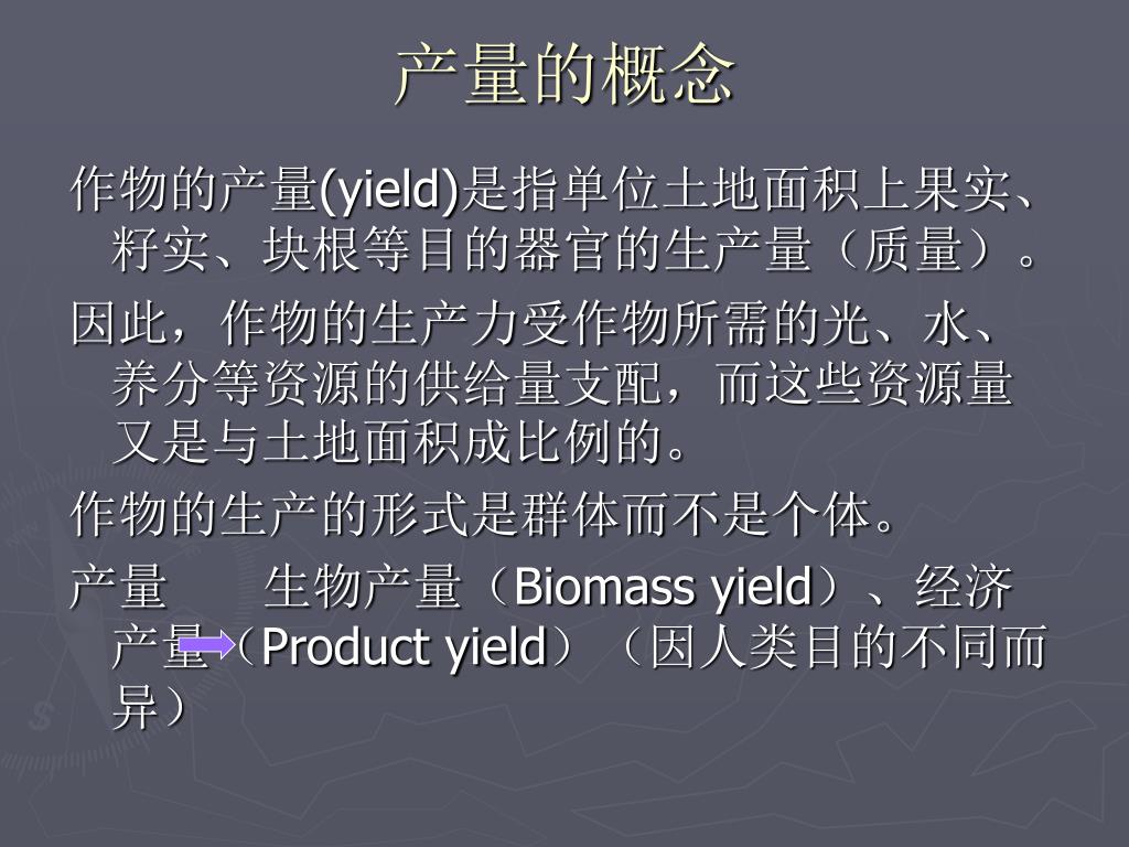 产量的概念 作物的产量(yield)是指单位土地面积上果实、籽实、块根等目的器官的生产量(质量)。 因此,作物的生产力受作物所需的光、水、养分等资源的供给量支配,而这些资源量又是与土地面积成比例的。 作物的生产的形式是群体而不是个体。 产量 生物产量(Biomass yield)、经济产量(Product yield)(因人类目的不同而异)