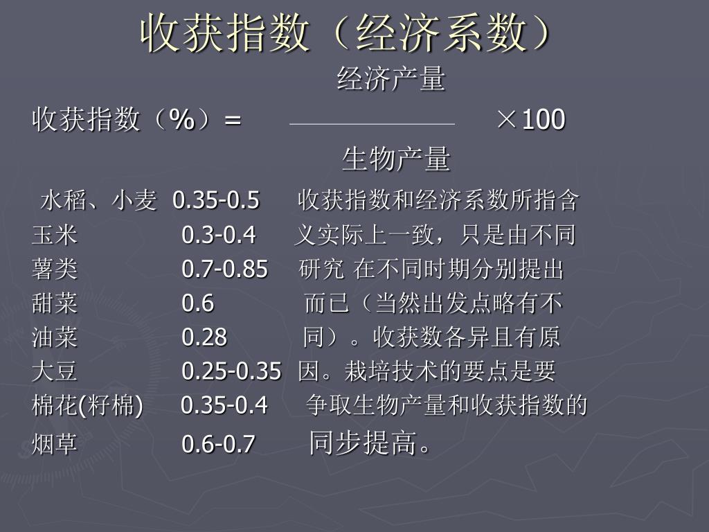 收获指数(经济系数) 经济产量 收获指数(%)= ×100 生物产量 水稻、小麦 0.35-0.5 收获指数和经济系数所指含 玉米 0.3-0.4 义实际上一致,只是由不同 薯类 0.7-0.85 研究 在不同时期分别提出 甜菜 0.6 而已(当然出发点略有不 油菜 0.28 同)。收获数各异且有原 大豆 0.25-0.35 因。栽培技术的要点是要 棉花(籽棉) 0.35-0.4 争取生物产量和收获指数的 烟草 0.6-0.7同步提高。
