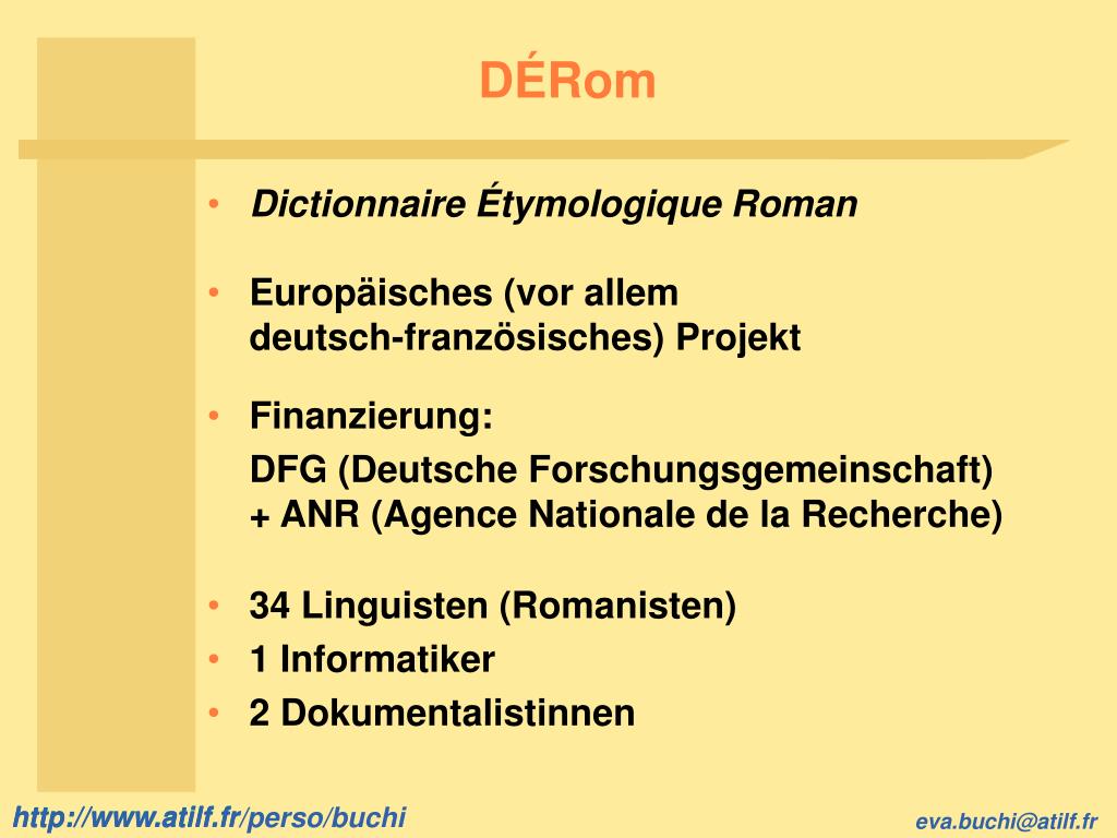DÉRom • Dictionnaire Étymologique Roman • Europäisches (vor allem • deutsch-französisches) Projekt • Finanzierung: • DFG (Deutsche Forschungsgemeinschaft) + ANR (Agence Nationale de la Recherche) • 34 Linguisten (Romanisten) • 1 Informatiker • 2 Dokumentalistinnen