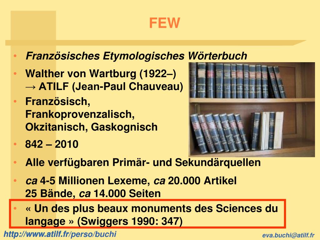 FEW • Französisches Etymologisches Wörterbuch • ca 4-5 Millionen Lexeme, ca 20.000 Artikel 25 Bände, ca 14.000 Seiten • Walther von Wartburg (1922–) • → ATILF (Jean-Paul Chauveau) • Französisch, Frankoprovenzalisch, Okzitanisch, Gaskognisch • 842 – 2010 • Alle verfügbaren Primär- und Sekundärquellen • « Un des plus beaux monuments des Sciences du langage » (Swiggers 1990: 347)