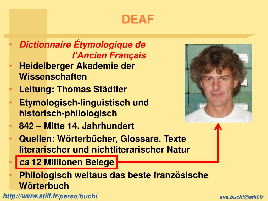 DEAF • Dictionnaire Étymologique de l’Ancien Français • Heidelberger Akademie der Wissenschaften • Leitung: Thomas Städtler • Etymologisch-linguistisch und • historisch-philologisch • 842 – Mitte 14. Jahrhundert • Quellen: Wörterbücher, Glossare, Texte literarischer und nichtliterarischer Natur • ca 12 Millionen Belege • Philologisch weitaus das beste französische Wörterbuch
