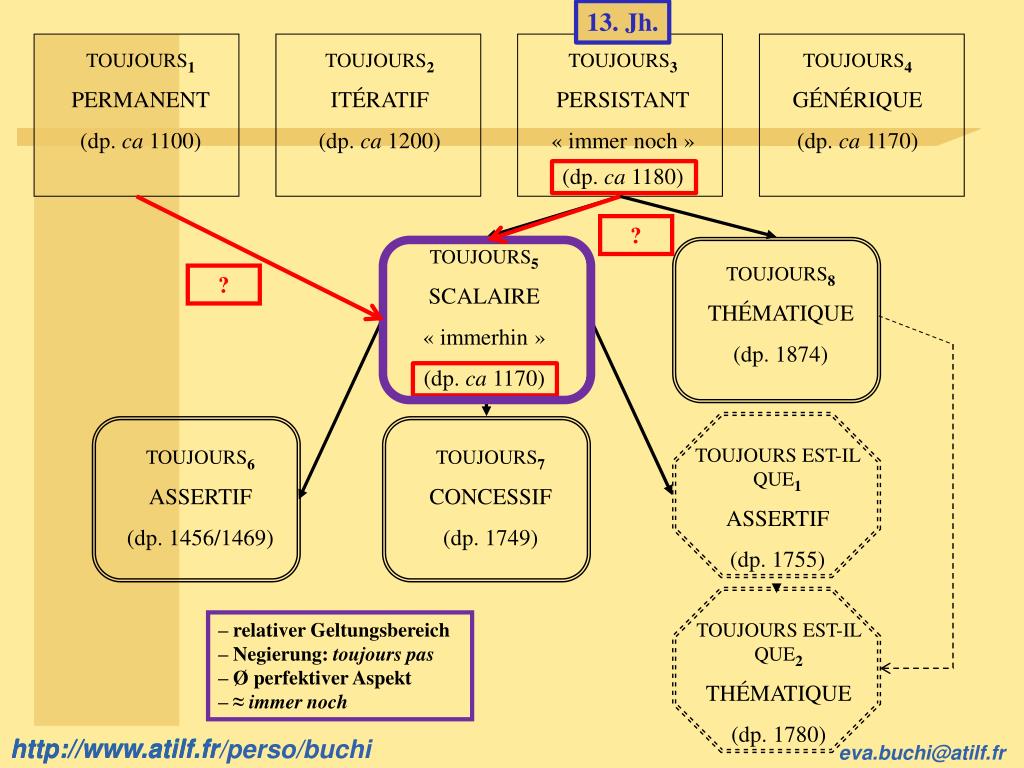 TOUJOURS1 PERMANENT (dp. ca 1100) TOUJOURS2 ITÉRATIF (dp. ca 1200) TOUJOURS3 PERSISTANT « immer noch » (dp. ca 1180) TOUJOURS4 GÉNÉRIQUE (dp. ca 1170) TOUJOURS5 SCALAIRE « immerhin » (dp. ca 1170) TOUJOURS8 THÉMATIQUE (dp. 1874) TOUJOURS EST-IL QUE1 ASSERTIF (dp. 1755) TOUJOURS6 ASSERTIF (dp. 1456/1469) TOUJOURS7 CONCESSIF (dp. 1749) TOUJOURS EST-IL QUE2 THÉMATIQUE (dp. 1780) 13. Jh. ? ? – relativer Geltungsbereich – Negierung: toujours pas – Ø perfektiver Aspekt – ≈ immer noch