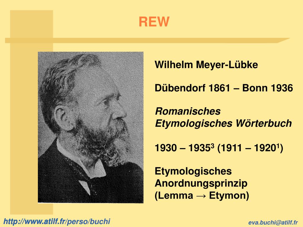 REW Wilhelm Meyer-Lübke Dübendorf 1861 – Bonn 1936 Romanisches Etymologisches Wörterbuch 1930 – 19353 (1911 – 19201) Etymologisches Anordnungsprinzip (Lemma → Etymon)