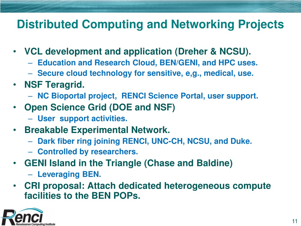 Distributed Computing and Networking Projects • VCL development and application (Dreher & NCSU). • Education and Research Cloud, BEN/GENI, and HPC uses. • Secure cloud technology for sensitive, e,g., medical, use. • NSF Teragrid. • NC Bioportal project, RENCI Science Portal, user support. • Open Science Grid (DOE and NSF) • User support activities. • Breakable Experimental Network. • Dark fiber ring joining RENCI, UNC-CH, NCSU, and Duke. • Controlled by researchers. • GENI Island in the Triangle (Chase and Baldine) • Leveraging BEN. • CRI proposal: Attach dedicated heterogeneous compute facilities to the BEN POPs.