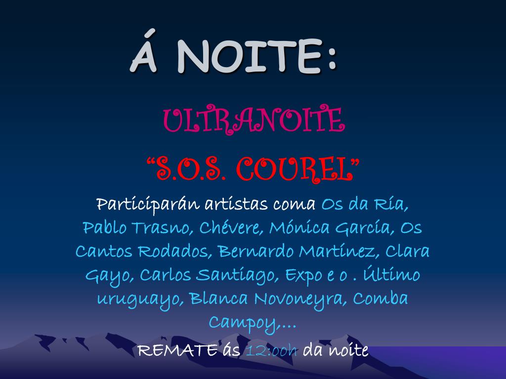 Á NOITE: ULTRANOITE “S.O.S. COUREL” Participarán artistas coma Os da Ría, Pablo Trasno, Chévere, Mónica García, Os Cantos Rodados, Bernardo Martínez, Clara Gayo, Carlos Santiago, Expo e o . Último uruguayo, Blanca Novoneyra, Comba Campoy,… REMATE ás 12:oohda noite