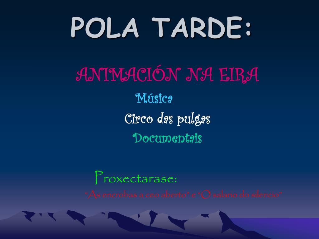ANIMACIÓN NA EIRA Música Circo das pulgas Documentais Proxectarase: “As encrobas a ceo aberto” e “O salario do silencio” POLA TARDE: