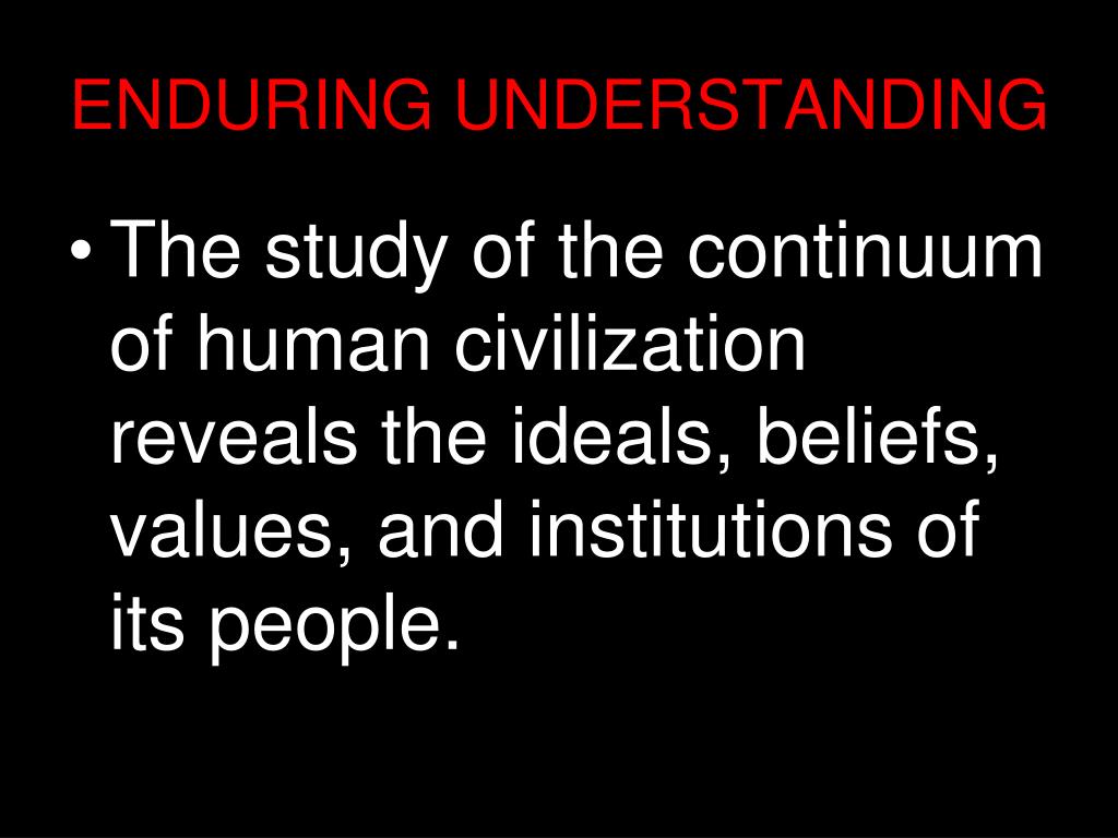 ENDURING UNDERSTANDING • The study of the continuum of human civilization reveals the ideals, beliefs, values, and institutions of its people.