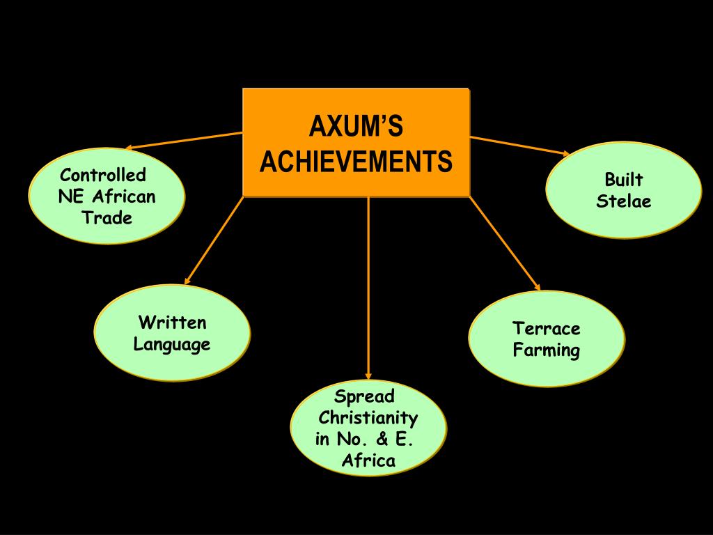 AXUM’SACHIEVEMENTS Built Stelae Controlled NE African Trade Written Language Terrace Farming Spread Christianity in No. & E. Africa