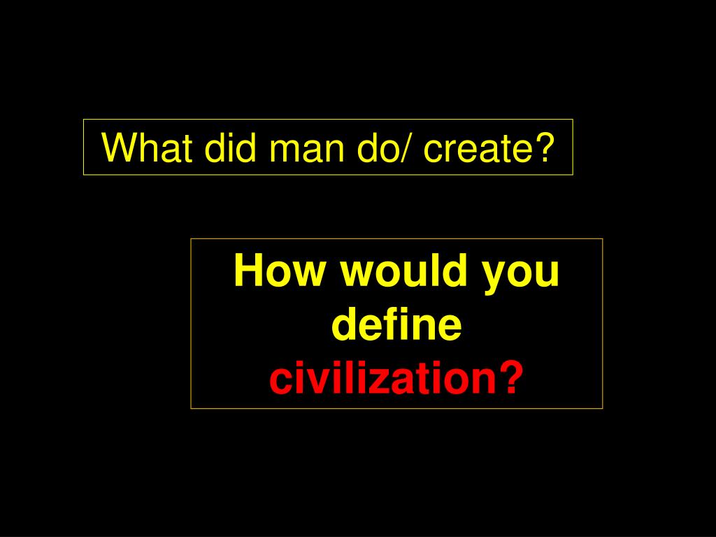 Homo habilis. Homo sapiens. Homo erectus. Migrated from one place to the other. Domesticated animals and settled permanently (protection/help). Leaders emerge. Systems of writing were invented. Infrastructures were made. What did man do/ create?. How would you define civilization?.