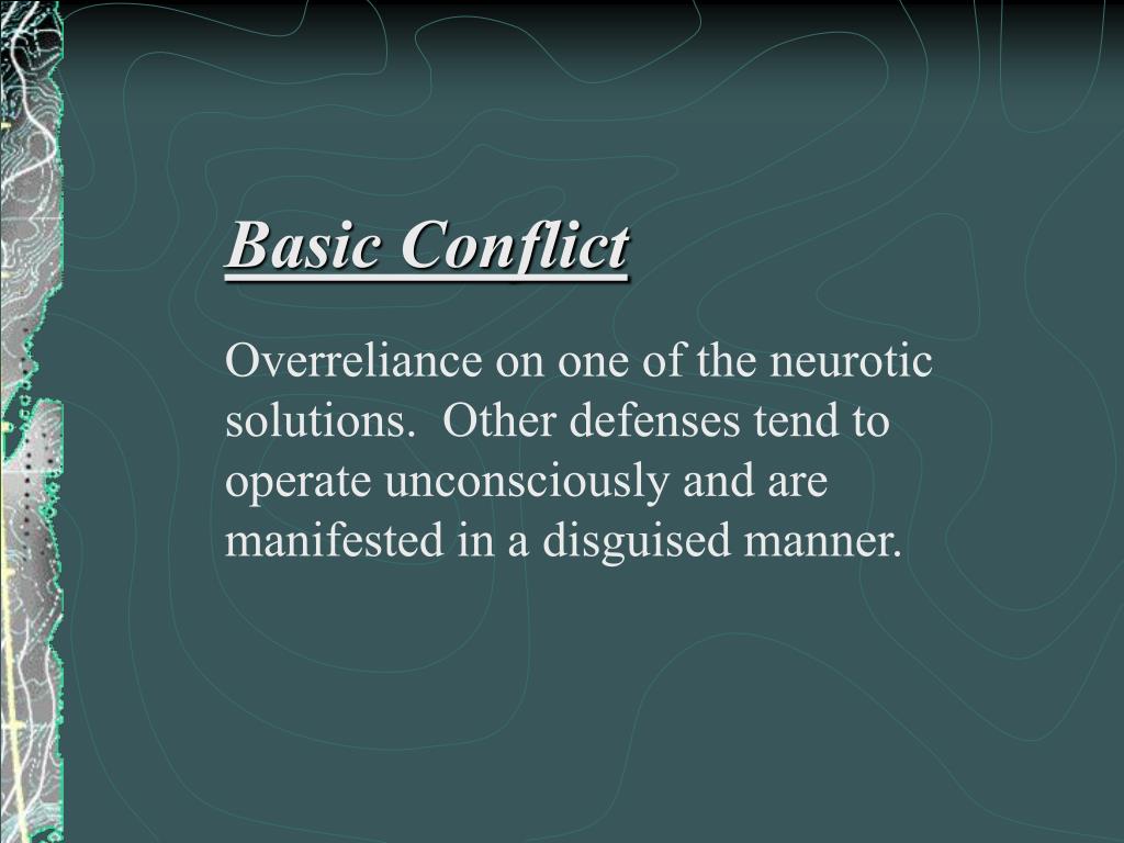 Basic Conflict Overreliance on one of the neurotic solutions. Other defenses tend to operate unconsciously and are manifested in a disguised manner.
