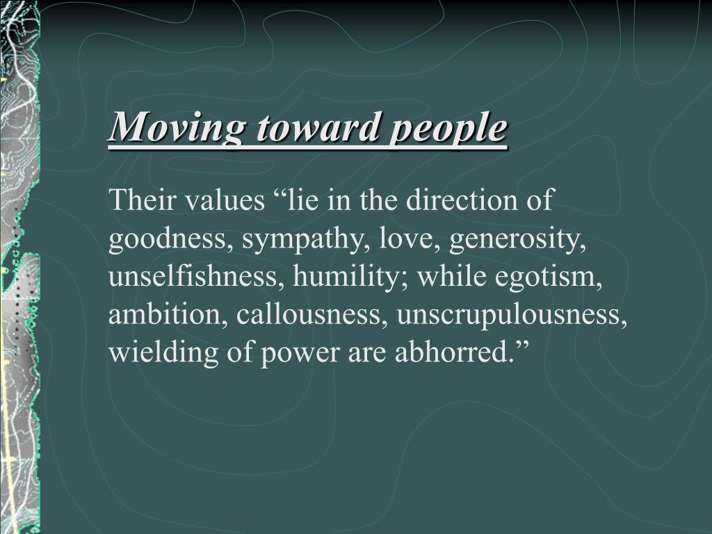 Moving toward people Their values “lie in the direction of goodness, sympathy, love, generosity, unselfishness, humility; while egotism, ambition, callousness, unscrupulousness, wielding of power are abhorred.”