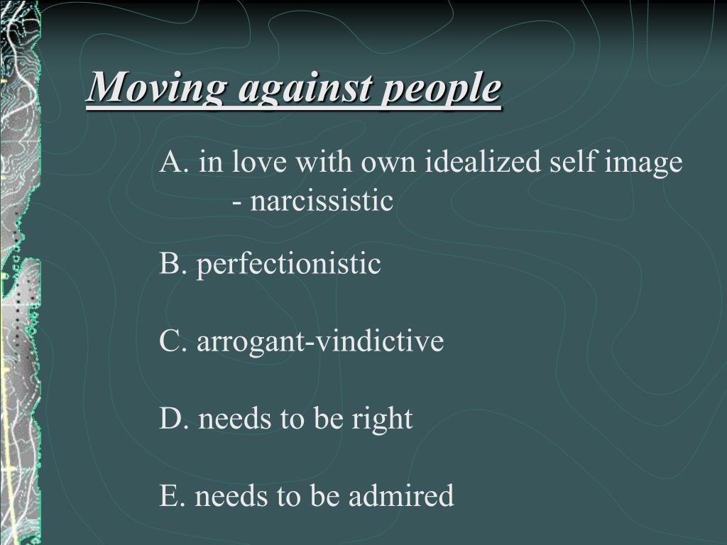 Moving against people A. in love with own idealized self image - narcissistic B. perfectionistic C. arrogant-vindictive D. needs to be right E. needs to be admired