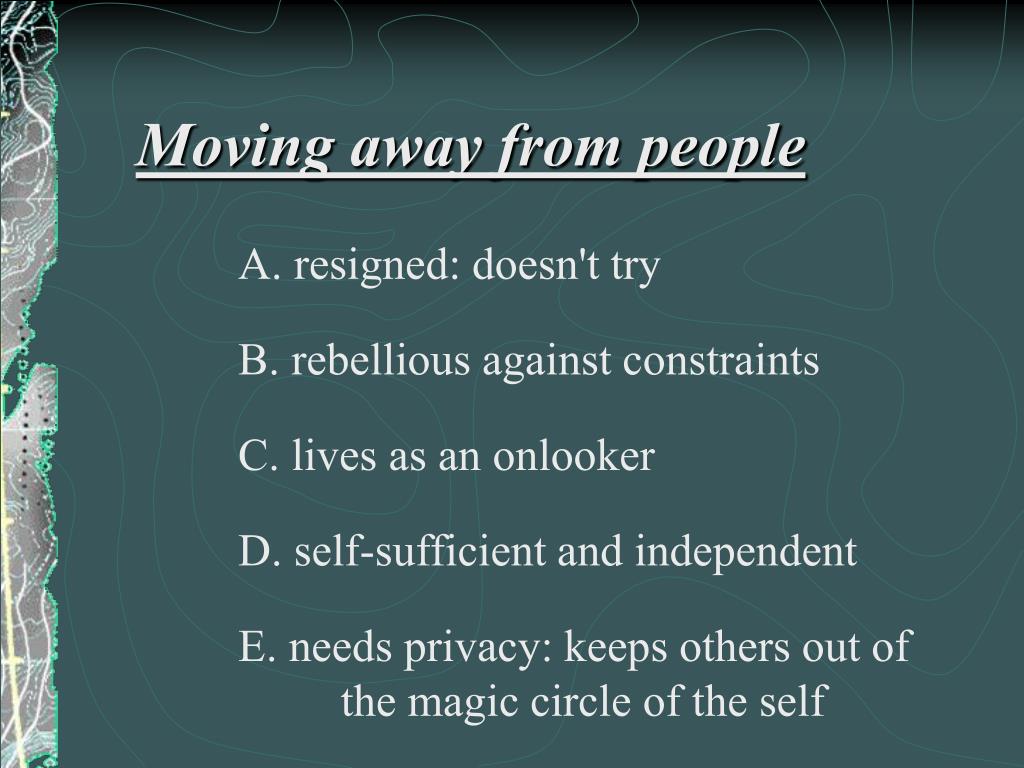 Moving away from people A. resigned: doesn't try B. rebellious against constraints C. lives as an onlooker D. self-sufficient and independent E. needs privacy: keeps others out of the magic circle of the self