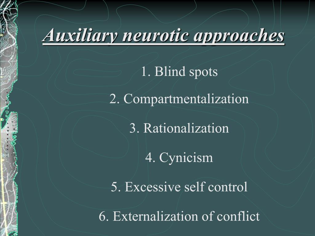 Auxiliary neurotic approaches 1. Blind spots 2. Compartmentalization 3. Rationalization 4. Cynicism 5. Excessive self control 6. Externalization of conflict