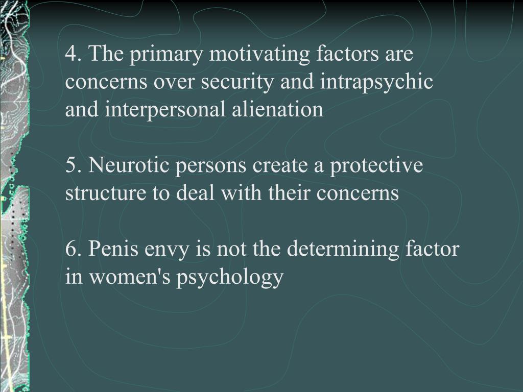 4. The primary motivating factors are concerns over security and intrapsychic and interpersonal alienation 5. Neurotic persons create a protective structure to deal with their concerns 6. Penis envy is not the determining factor in women's psychology