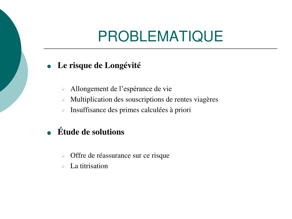 PROBLEMATIQUE • Le risque de Longévité • Allongement de l’espérance de vie • Multiplication des souscriptions de rentes viagères • Insuffisance des primes calculées à priori • Étude de solutions • Offre de réassurance sur ce risque • La titrisation